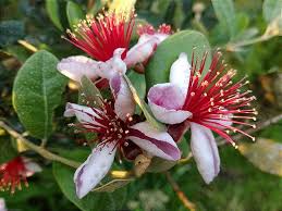 Floração Ornamental e Comestível: Além de produzirem frutos, as flores da goiaba-serrana são comestíveis e muito perfumadas, atraindo abelhas com seus estames vermelhos e brancos.